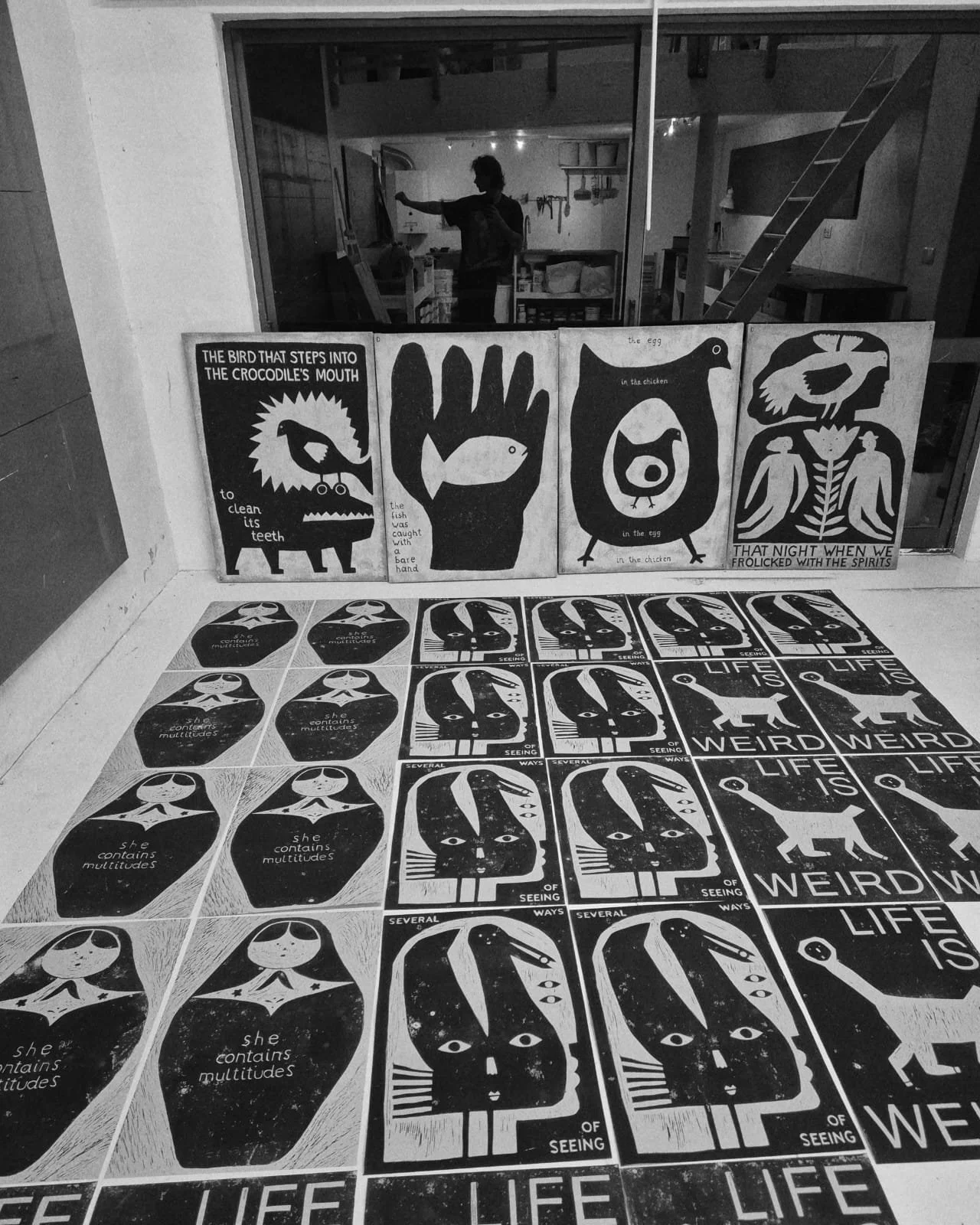 As a self-taught painter and printer maker, the German artist David Schmitt, chosen to work under the moniker Tuyo. His work inhabits a wonderful naive aesthetic that to himself feels like a crossover between Folk, Pop, and Cave art. With a focus and love of tactile textures and rough shapes he is able to capture timeless simplicity with his bold visual presence and commentary that feels human.